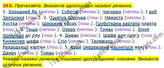 Прочитайте. Визначте односкладні називні речення. 1. Холодний Яр (непош.). Суботів (непош.). Чигирин (непош.). І дуб Залізняка (пош.). 2. Ошатна сорочка (пош.). Намисто (непош.). Хустка (непош.). Широкий пасок (пош.). Груботкана картата плахта (пош.). 3. Тиша (непош.). Озеро (непош.). Туман (непош.). Зілля приклади до ран (пош.). 4. Диван (непош.). Шафа для одягу (пош.). Книжкова шафа (пош.). Стіл (непош.). Телевізор (непош.). Репродукції картин (пош.). 5. Край смерековий насниться мені (пош.). Далеч (непош.). Туман (непош.). Укажіть називні речення, поширені другорядними членами. Визначте ці члени речення.