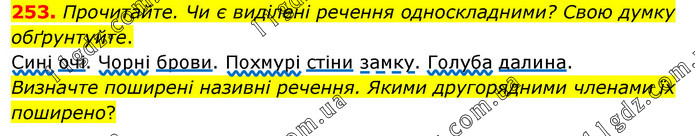 Прочитайте. Чи є виділені речення односкладними? Свою думку обґрунтуйте. Сині очі. Чорні брови. Похмурі стіни замку. Голуба далина. Визначте поширені називні речення. Якими другорядними членами їх поширено?