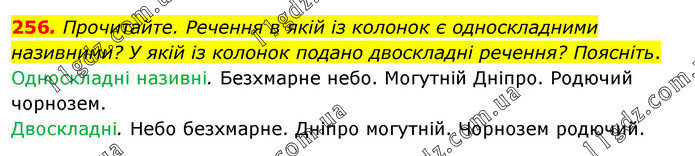 Прочитайте. Речення в якій із колонок є односкладними називними? У якій із колонок подано двоскладні речення? Поясніть. Односкладні називні. Безхмарне небо. Могутній Дніпро. Родючий чорнозем. Двоскладні. Небо безхмарне. Дніпро могутній. Чорнозем родючий.