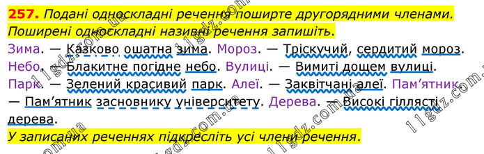 Подані односкладні речення поширте другорядними членами. Поширені односкладні називні речення запишіть. Зима. — Казково ошатна зима. Мороз. — Тріскучий, сердитий мороз. Небо. — Блакитне погідне небо. Вулиці. — Вимиті дощем вулиці. Парк. — Зелений красивий парк. Алеї. — Заквітчані алеї. Пам’ятник. — Пам’ятник засновнику університету. Дерева. — Високі гіллясті дерева. У записаних реченнях підкресліть усі члени речення.