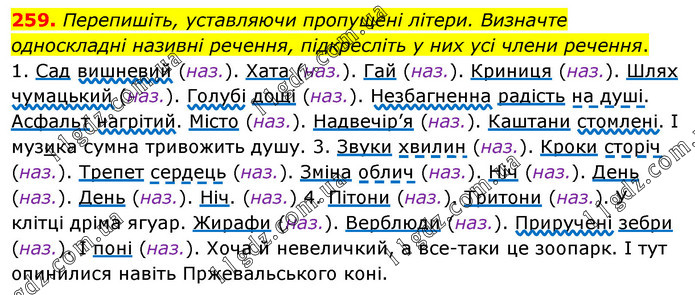 Перепишіть, уставляючи пропущені літери. Визначте односкладні називні речення, підкресліть у них усі члени речення. 1. Сад вишневий (наз.). Хата (наз.). Гай (наз.). Криниця (наз.). Шлях чумацький (наз.). Голубі дощі (наз.). Незбагненна радість на душі. Асфальт нагрітий. Місто (наз.). Надвечір’я (наз.). Каштани стомлені. І музика сумна тривожить душу. 3. Звуки хвилин (наз.). Кроки сторіч (наз.). Трепет сердець (наз.). Зміна облич (наз.). Ніч (наз.). День (наз.). День (наз.). Ніч. (наз.) 4. Пітони (наз.). Тритони (наз.). У клітці дріма ягуар. Жирафи (наз.). Верблюди (наз.). Приручені зебри (наз.). І поні (наз.). Хоча й невеличкий, а все-таки це зоопарк. І тут опинилися навіть Пржевальського коні.