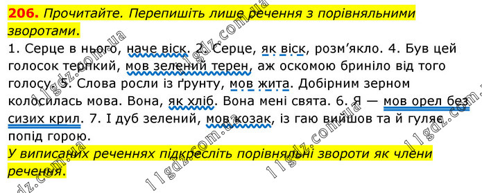 Прочитайте. Перепишіть лише речення з порівняльними зворотами. 1. Серце в нього, наче віск. 2. Серце, як віск, розм’якло. 4. Був цей голосок терпкий, мов зелений терен, аж оскомою бриніло від того голосу. 5. Слова росли із ґрунту, мов жита. Добірним зерном колосилась мова. Вона, як хліб. Вона мені свята. 6. Я — мов орел без сизих крил. 7. І дуб зелений, мов козак, із гаю вийшов та й гуляє попід горою. У виписаних реченнях підкресліть порівняльні звороти як члени речення.