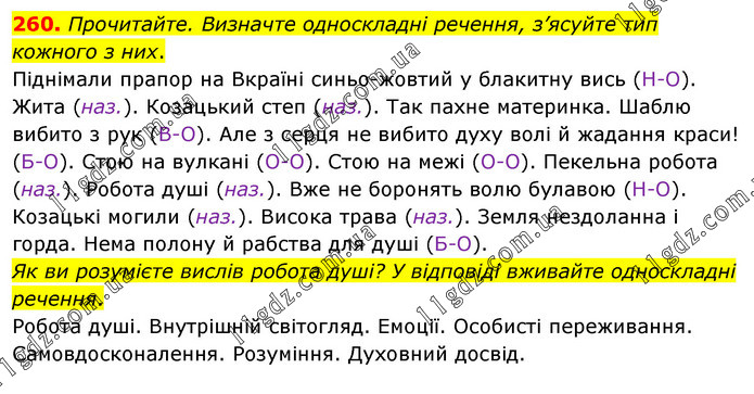 Прочитайте. Визначте односкладні речення, з’ясуйте тип кожного з них. Піднімали прапор на Вкраїні синьо-жовтий у блакитну вись (Н-О). Жита (наз.). Козацький степ (наз.). Так пахне материнка. Шаблю вибито з рук (В-О). Але з серця не вибито духу волі й жадання краси! (Б-О). Стою на вулкані (О-О). Стою на межі (О-О). Пекельна робота (наз.). Робота душі (наз.). Вже не боронять волю булавою (Н-О). Козацькі могили (наз.). Висока трава (наз.). Земля нездоланна і горда. Нема полону й рабства для душі (Б-О). Як ви розумієте вислів робота душі? У відповіді вживайте односкладні речення. Робота душі. Внутрішній світогляд. Емоції. Особисті переживання. Самовдосконалення. Розуміння. Духовний досвід.