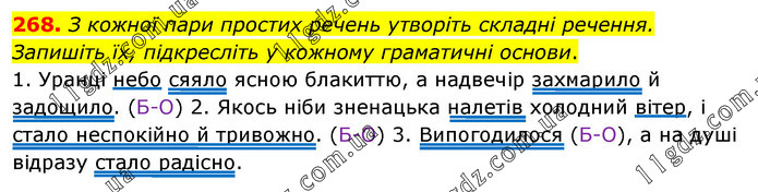 З кожної пари простих речень утворіть складні речення. Запишіть їх, підкресліть у кожному граматичні основи. 1. Уранці небо сяяло ясною блакиттю, а надвечір захмарило й задощило. (Б-О) 2. Якось ніби зненацька налетів холодний вітер, і стало неспокійно й тривожно. (Б-О) 3. Випогодилося (Б-О), а на душі відразу стало радісно.