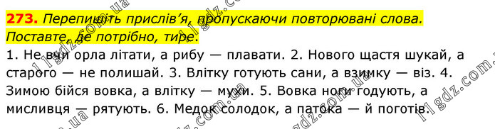 Перепишіть прислів’я, пропускаючи повторювані слова. Поставте, де потрібно, тире. 1. Не вчи орла літати, а рибу — плавати. 2. Нового щастя шукай, а старого — не полишай. 3. Влітку готують сани, а взимку — віз. 4. Зимою бійся вовка, а влітку — мухи. 5. Вовка ноги годують, а мисливця — рятують. 6. Медок солодок, а патока — й поготів.