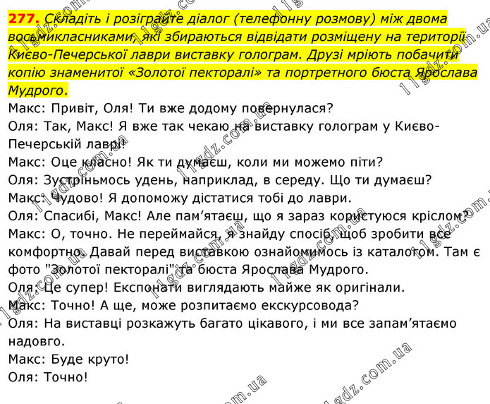Складіть і розіграйте діалог (телефонну розмову) між двома восьмикласниками, які збираються відвідати розміщену на території Києво-Печерської лаври виставку голограм. Друзі мріють побачити копію знаменитої «Золотої пекторалі» та портретного бюста Ярослава Мудрого. Макс: Привіт, Оля! Ти вже додому повернулася? Оля: Так, Макс! Я вже так чекаю на виставку голограм у Києво-Печерській лаврі! Макс: Оце класно! Як ти думаєш, коли ми можемо піти? Оля: Зустріньмось удень, наприклад, в середу. Що ти думаєш? Макс: Чудово! Я допоможу дістатися тобі до лаври. Оля: Спасибі, Макс! Але пам’ятаєш, що я зараз користуюся кріслом? Макс: О, точно. Не переймайся, я знайду спосіб, щоб зробити все комфортно. Давай перед виставкою ознайомимось із каталогом. Там є фото "Золотої пекторалі" та бюста Ярослава Мудрого. Оля: Це супер! Експонати виглядають майже як оригінали. Макс: Точно! А ще, може розпитаємо екскурсовода? Оля: На виставці розкажуть багато цікавого, і ми все запам’ятаємо надовго. Макс: Буде круто! Оля: Точно!