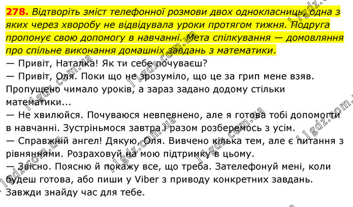 Відтворіть зміст телефонної розмови двох однокласниць, одна з яких через хворобу не відвідувала уроки протягом тижня. Подруга пропонує свою допомогу в навчанні. Мета спілкування — домовляння про спільне виконання домашніх завдань з математики. — Привіт, Наталка! Як ти себе почуваєш? — Привіт, Оля. Поки що не зрозуміло, що це за грип мене взяв. Пропущено чимало уроків, а зараз задано додому стільки математики... — Не хвилюйся. Почуваюся невпевнено, але я готова тобі допомогти в навчанні. Зустріньмося завтра і разом розберемось з усім. — Справжній ангел! Дякую, Оля. Вивчено кілька тем, але є питання з рівняннями. Розраховуй на мою підтримку в цьому. — Звісно. Поясню й покажу все, що треба. Зателефонуй мені, коли будеш готова, або пиши у Viber з приводу конкретних завдань. Завжди знайду час для тебе.