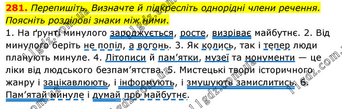 Перепишіть. Визначте й підкресліть однорідні члени речення. Поясніть розділові знаки між ними. 1. На ґрунті минулого зароджується, росте, визріває майбутнє. 2. Від минулого беріть не попіл, а вогонь. 3. Як колись, так і тепер люди планують минуле. 4. Літописи й пам’ятки, музеї та монументи — це ліки від людського безпам’ятства. 5. Мистецькі твори історичного жанру і зацікавлюють, і інформують, і змушують замислитись. 6. Пам’ятай минуле і думай про майбутнє.