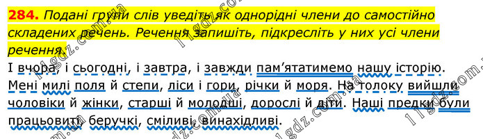 Подані групи слів уведіть як однорідні члени до самостійно складених речень. Речення запишіть, підкресліть у них усі члени речення. І вчора, і сьогодні, і завтра, і завжди пам’ятатимемо нашу історію. Мені милі поля й степи, ліси і гори, річки й моря. На толоку вийшли чоловіки й жінки, старші й молодші, дорослі й діти. Наші предки були працьовиті, беручкі, сміливі, винахідливі.
