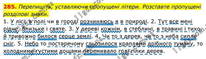 Перепишіть, уставляючи пропущені літери. Розставте пропущені розділові знаки. 1. У лісі, в полі чи в городі розчиняюсь я в природі. 2. Тут все мені рідне, близьке і святе. 3. У дереві кожнім, в стеблині, в травині і тихо, й тривожно билося серце землі. 4. Чи то з дерев, чи то з неба сипле сніг. 5. Небо то постаречому сльозилося краплями дрібного туману, то холодними густими дощами перемивало голі гілки дерев.