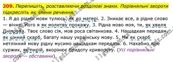 Перепишіть, розставляючи розділові знаки. Порівняльні звороти підкресліть як члени речення. 1. Я до рідної мови тулюсь, як до матері. 2. Зникає все, а рідне слово — вічне. Його я як молитву прокажу. 3. Рідна мово моя, ти, як хвиля Дніпрова. Твоє слово сія, мов роса світанкова. 4. Нащадкам передам, як цінний скарб, багату нашу українську мову. 5. Ми як скарб нетлінний мову рідну мусимо нащадкам передать. 6. Нахабно лізе суржик, як пирій, вкорінює бридоту кривороту. (Усі порівняльні звороти — обставини).