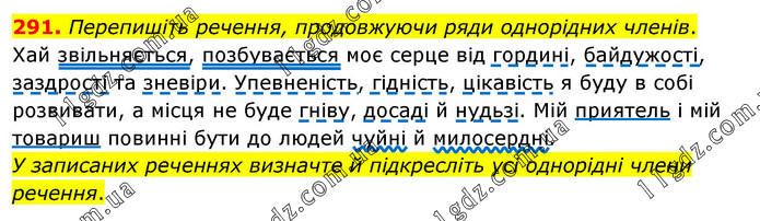 Перепишіть речення, продовжуючи ряди однорідних членів. Хай звільняється, позбувається моє серце від гордині, байдужості, заздрості та зневіри. Упевненість, гідність, цікавість я буду в собі розвивати, а місця не буде гніву, досаді й нудьзі. Мій приятель і мій товариш повинні бути до людей чуйні й милосердні. У записаних реченнях визначте й підкресліть усі однорідні члени речення.