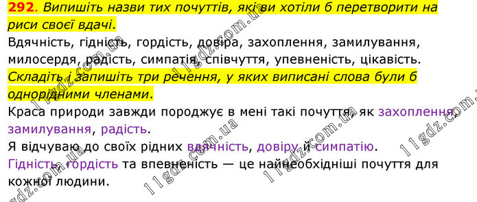 Випишіть назви тих почуттів, які ви хотіли б перетворити на риси своєї вдачі. Вдячність, гідність, гордість, довіра, захоплення, замилування, милосердя, радість, симпатія, співчуття, упевненість, цікавість. Складіть і запишіть три речення, у яких виписані слова були б однорідними членами. Краса природи завжди породжує в мені такі почуття, як захоплення, замилування, радість. Я відчуваю до своїх рідних вдячність, довіру й симпатію. Гідність, гордість та впевненість — це найнеобхідніші почуття для кожної людини.
