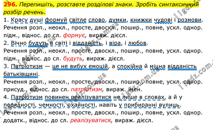 Перепишіть, розставте розділові знаки. Зробіть синтаксичний розбір речень. 1. Красу душі формуй світле слово, думки, книжки чудові і розмови. Речення розп., неокл., просте, двоскл., пошир., повне, ускл. однор. підм., віднос. до сл. формує, вираж. дієсл. 2. Вічно будуть в світі і відданість, і віра, і любов. Речення розп., неокл., просте, двоскл., пошир., повне, ускл. однор. підм., віднос. до сл. будуть, вираж. дієсл. 3. Патріотизм — це не вибух емоцій, а спокійна й міцна відданість батьківщині. Речення розп., неокл., просте, двоскл., пошир., повне, ускл. однор. присуд., віднос. до сл. патріотизм, вираж. імен. 4. Патріотизм повинен реалізуватися не лише в словах, а й у порядності, чемності, охайності, навіть у прибиранні вулиць. Речення розп., неокл., просте, двоскл., пошир., повне, ускл. однор. додатк., віднос. до сл. реалізуватися, вираж. дієсл.