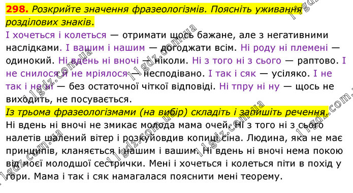 Розкрийте значення фразеологізмів. Поясніть уживання розділових знаків. І хочеться і колеться — отримати щось бажане, але з негативними наслідками. І вашим і нашим — догоджати всім. Ні роду ні племені — одинокий. Ні вдень ні вночі — ніколи. Ні з того ні з сього — раптово. І не снилося й не мріялося — несподівано. І так і сяк — усіляко. І не так і не ні — без остаточної чіткої відповіді. Ні тпру ні ну — щось не виходить, не посувається. Із трьома фразеологізмами (на вибір) складіть і запишіть речення. Ні вдень ні вночі не змикає молода мама очей. Ні з того ні з сього налетів шалений вітер і розкуйовдив копиці сіна. Людина, яка не має принципів, кланяється і нашим і вашим. Ні вдень ні вночі нема покою від моєї молодшої сестрички. Мені і хочеться і колеться піти в похід у гори. Мама і так і сяк намагалася пояснити мені теорему.