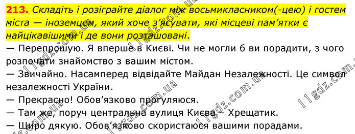 Складіть і розіграйте діалог між восьмикласником(-цею) і гостем міста — іноземцем, який хоче з’ясувати, які місцеві пам’ятки є найцікавішими і де вони розташовані. — Перепрошую. Я вперше в Києві. Чи не могли б ви порадити, з чого розпочати знайомство з вашим містом. — Звичайно. Насамперед відвідайте Майдан Незалежності. Це символ незалежності України. — Прекрасно! Обов’язково прогуляюся. — Там же, поруч центральна вулиця Києва – Хрещатик. — Щиро дякую. Обов’язково скористаюся вашими порадами.