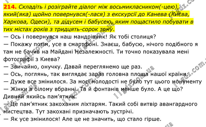 Складіть і розіграйте діалог між восьмикласником(-цею), який(яка) щойно повернувся(-лася) з екскурсії до Канева (Києва, Харкова, Одеси), та дідусем і бабусею, яким пощастило побувати в тих містах років з тридцять-сорок тому. — Ось і повернувся наш мандрівник! Як тобі столиця? — Покажу потім, усе в смартфоні. Знаєш, бабусю, нічого подібного я там не бачив на Майдані Незалежності. Ти точно показувала мені фотографії з Киева? — Звичайно, онучку. Давай переглянемо ще раз. — Ось, поглянь, так виглядає зараз головна площа нашої країни. — Дуже все змінилося. За моєї молодості не було тут цього монументу — Жінки в білому вбранні. Та й фонтанів менше було. А це що? Дивний якийсь пам’ятник. — Це пам’ятник закоханим ліхтарям. Такий собі витвір авангардного мистецтва. Тут закохані призначають зустрічі. — Як усе змінилося! Але це не значить, що стало гірше.