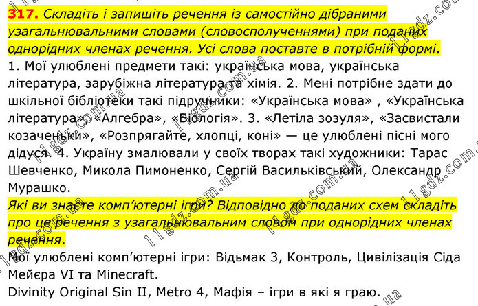 Складіть і запишіть речення із самостійно дібраними узагальнювальними словами (словосполученнями) при поданих однорідних членах речення. Усі слова поставте в потрібній формі. 1. Мої улюблені предмети такі: українська мова, українська література, зарубіжна література та хімія. 2. Мені потрібне здати до шкільної бібліотеки такі підручники: «Українська мова» , «Українська література», «Алгебра», «Біологія». 3. «Летіла зозуля», «Засвистали козаченьки», «Розпрягайте, хлопці, коні» — це улюблені пісні мого дідуся. 4. Україну змалювали у своїх творах такі художники: Тарас Шевченко, Микола Пимоненко, Сергій Васильківський, Олександр Мурашко. Які ви знаєте комп’ютерні ігри? Відповідно до поданих схем складіть про це речення з узагальнювальним словом при однорідних членах речення. Мої улюблені комп’ютерні ігри: Відьмак 3, Контроль, Цивілізація Сіда Мейєра VI та Minecraft. Divinity Original Sin II, Metro 4, Мафія – ігри в які я граю.