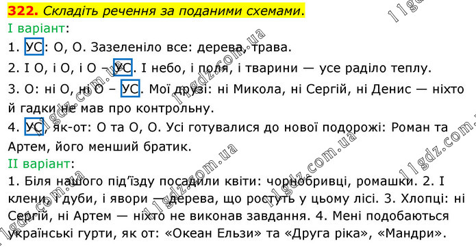 Складіть речення за поданими схемами. І варіант: 1. УС: О, О. Зазеленіло все: дерева, трава. 2. І О, і О, і О – УС. І небо, і поля, і тварини — усе раділо теплу. 3. О: ні О, ні О – УС. Мої друзі: ні Микола, ні Сергій, ні Денис — ніхто й гадки не мав про контрольну. 4. УС, як-от: О та О, О. Усі готувалися до нової подорожі: Роман та Артем, його менший братик. ІІ варіант: 1. Біля нашого під’їзду посадили квіти: чорнобривці, ромашки. 2. І клени, і дуби, і явори — дерева, що ростуть у цьому лісі. 3. Хлопці: ні Сергій, ні Артем — ніхто не виконав завдання. 4. Мені подобаються українські гурти, як от: «Океан Ельзи» та «Друга ріка», «Мандри».