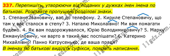 Перепишіть, утворюючи від поданих у дужках імен імена по батькові. Розставте пропущені розділові знаки. 1. Степане Івановичу, вас до телефону. 2. Кириле Степановичу, що там у вас сталося в степу? 3. Наталю Миколаївно! Ми вам помагати будемо. 4. Як вам подорожувалося, Юрію Володимировичу? 5. Марку Еммануїловичу, чи варто в такий час поспішати? 6. Катерино Михайлівно! Панно Катрусенько, де ваша праця? В іменах по батькові виділіть суфікси, поясніть написання.