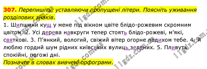 Перепишіть, уставляючи пропущені літери. Поясніть уживання розділових знаків. 1. Шипшини кущ у мене під вікном цвіте блідо-рожевим скромним цвітом. 2. Усі дерева навкруги тепер стоять блідо-рожеві, м’які, святкові. 3. П’янкий, вологий, свіжий вітер огорне подихом тебе. 4. Я люблю гордий шум рідних київських вулиць зелених. 5. Пливуть спокійні, погожі дні. Позначте в словах вивчені орфограми.