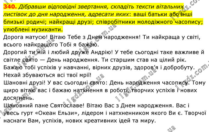 Дібравши відповідні звертання, складіть тексти вітальних листівок до дня народження, адресати яких: ваші батьки або інші близькі родичі; найкращі друзі; співробітники молодіжного часопису; улюблені музиканти. Дорога матусю! Вітаю Тебе з Днем народження! Ти найкраща у світі, всього найкращого Тобі я бажаю. Дорогий ти мій і любий друже Андрію! У тебе сьогодні таке важливе й світле свято — День народження. Ти старшим став на цілий рік. Бажаю тобі успіхів у навчанні, вірних друзів, здоров’я і добробуту. Нехай збуваються всі твої мрії! Шановні друзі! У вас сьогодні свято: День народження часопису. Тому щиро вітаю вас і бажаю натхнення в роботі, творчих успіхів і нових досягнень. Шановний пане Святославе! Вітаю Вас з Днем народження. Вас і увесь гурт «Океан Ельзи», лідером і натхненником якого Ви є. Творчої наснаги Вам, успіхів, нових креативних ідей та миру.