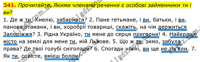 Прочитайте. Якими членами речення є особові займенники ти і ви? 1. Де ж ти, Хмелю, забарився? 2. Пане гетьмане, і ви, батьки, і ви, панове отамани, і ви, хоробрії товариші, скажіть, на чім держиться Запоріжжя? 3. Рідна Україно, ти мене до серця пригорни! 4. Найкраще місто на землі для мене ти, мій Львове. 5. Що ж ти, зимо, забула права? Де твої голубі снігопади? 6. Спогади ніжні, ви ще не зів’яли. 7. Як ти, совісте, вмієш боліти!