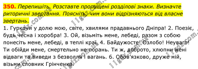 Перепишіть. Розставте пропущені розділові знаки. Визначте риторичні звертання. Поясніть, чим вони відрізняються від власне звертань. 1. Гуркочи у долю мою, світе, хвилями прадавнього Дніпра! 2. Поезіє, будь чесна і хоробра! 3. Ой, візьміть мене, лебеді, разом з собою понесіть мене, лебеді, в теплі краї. 4. Байдужосте! Озлобо! Неуваго! Ти обійди мене, смертельно не порань. Ти ж, доброто, хлюпни мені відваги та виведи з безволля і вагань. 6. Обов’язково, друже мій, візьми словник Грінченка.