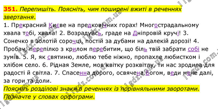 Перепишіть. Поясніть, чим поширені вжиті в реченнях звертання. 1. Прекрасний Києве на предковічних горах! Многострадальному хвала тобі, хвала! 2. Возрадуйсь, граде на Дніпровій кручі! 3. Сонечко в золотій сорочці, постій за дубами на далекій дорозі! 4. Пробач, перепілко з крилом перебитим, що біль твій забрати собі не зумів. 5. Я, як святиню, люблю тебе ніжно, пропахле любистком і хлібом село. 6. Рідная Земле, мов квітку розквітлу, ти нас зродила для радості й світла. 7. Спасенна дорого, освячена Богом, веди мене далі, за гори та доли. Поясніть розділові знаки в реченнях із порівняльними зворотами. Позначте у словах орфограми.
