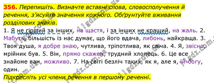 Перепишіть. Визначте вставні слова, словосполучення й речення, з’ясуйте значення кожного. Обґрунтуйте вживання розділових знаків. 1. Я не гірший за інших, на щастя, і за інших не кращий, на жаль. 2. Мабуть, більшість із нас думає, що його вдача, либонь, найкраща. 3. Твоя душа, я добре знаю, чутлива, тріпотлива, як свіча. 4. Я, звісно, мрійник був. 5. Він, прямо скажем, трудний хлопець. 6. Це все знайоме вам, можливо. 7. На світі безліч таких, як я, але я, їй-богу, один. Підкресліть усі члени речення в першому реченні.