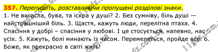 Перепишіть, розставляючи пропущені розділові знаки. 1. Не вигасла, бува, та іскра у душі? 2. Без сумніву, біль душі — найстрашніший біль. 3. Щастя, кажуть люди, перелітна птаха. 4. Спасіння у добрі – спасіння у любові. І це стосується, напевно, нас усіх. 5. Кажуть, болі минають із часом. Перемелеться, пройде все. 6. Боже, як прекрасно в світі жить!