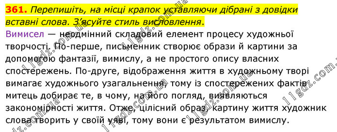 Перепишіть, на місці крапок уставляючи дібрані з довідки вставні слова. З’ясуйте стиль висловлення. Вимисел — неодмінний складовий елемент процесу художньої творчості. По-перше, письменник створює образи й картини за допомогою фантазії, вимислу, а не простого опису власних спостережень. По-друге, відображення життя в художньому творі вимагає художнього узагальнення, тому із спостережених фактів митець добирає те, в чому, на його погляд, виявляються закономірності життя. Отже, цілісний образ, картину життя художник слова творить у своїй уяві, тому вони є результатом вимислу.
