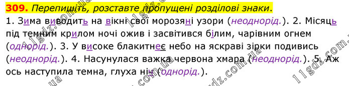 Перепишіть, розставте пропущені розділові знаки. 1. Зима виводить на вікні свої морозяні узори (неоднорід.). 2. Місяць під темним крилом ночі ожив і засвітився білим, чарівним огнем (однорід.). 3. У високе блакитнеє небо на яскраві зірки подивись (неоднорід.). 4. Насунулася важка червона хмара (неоднорід.). 5. Аж ось наступила темна, глуха ніч (однорід.).