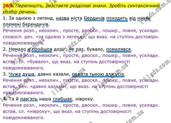 Перепишіть, розставте розділові знаки. Зробіть синтаксичний розбір речень. 1. За однією з легенд, назва міста Бердичів походить від назви племені берендичів. Речення розп., неоклич., просте, двоскл., пошир., повне, ускладн. словосп. реч. «за однією з легенд», що вказ. на ступінь достовірн. повідомлюваного. 2. Немало я пройшов доріг, не раз, бувало, помилявся. Речення розп., неоклич., просте, двоскл., пошир., повне, ускладн. встав, сл. «бувало», що вказ. на ступінь достовірності повідомлюваного. 3. Чужа душа, давно казали, повита тьмою для усіх. Речення розп., неоклич., просте, двоскл., пошир., повне, ускладн. встав, реч. «давно казали», що вказ. на ступінь достовірності повідомлюваного. 4. Та й пам’ять наша глибшає, нівроку. Речення розп., неоклич., просте, двоскл., пошир., повне, ускладн. встав, сл. «нівроку», що вказ. на ступінь достовірності повідомлюваного.
