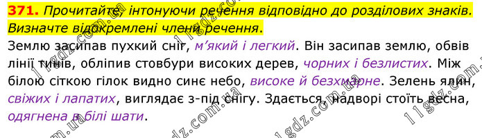 Прочитайте, інтонуючи речення відповідно до розділових знаків. Визначте відокремлені члени речення. Землю засипав пухкий сніг, м’який і легкий. Він засипав землю, обвів лінії тинів, обліпив стовбури високих дерев, чорних і безлистих. Між білою сіткою гілок видно синє небо, високе й безхмарне. Зелень ялин, свіжих і лапатих, виглядає з-під снігу. Здається, надворі стоїть весна, одягнена в білі шати.