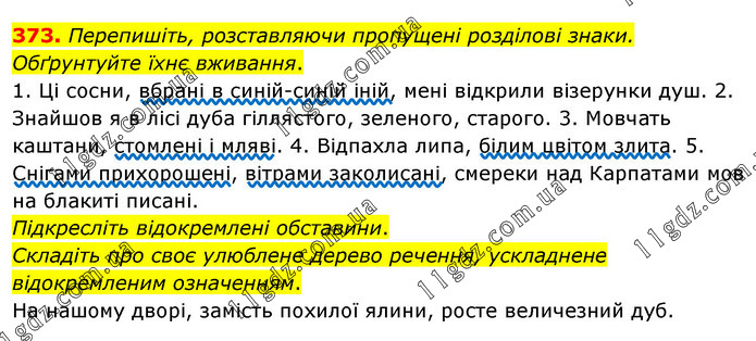 Перепишіть, розставляючи пропущені розділові знаки. Обґрунтуйте їхнє вживання. 1. Ці сосни, вбрані в синій-синій іній, мені відкрили візерунки душ. 2. Знайшов я в лісі дуба гіллястого, зеленого, старого. 3. Мовчать каштани, стомлені і мляві. 4. Відпахла липа, білим цвітом злита. 5. Снігами прихорошені, вітрами заколисані, смереки над Карпатами мов на блакиті писані. Підкресліть відокремлені обставини. Складіть про своє улюблене дерево речення, ускладнене відокремленим означенням. На нашому дворі, замість похилої ялини, росте величезний дуб.