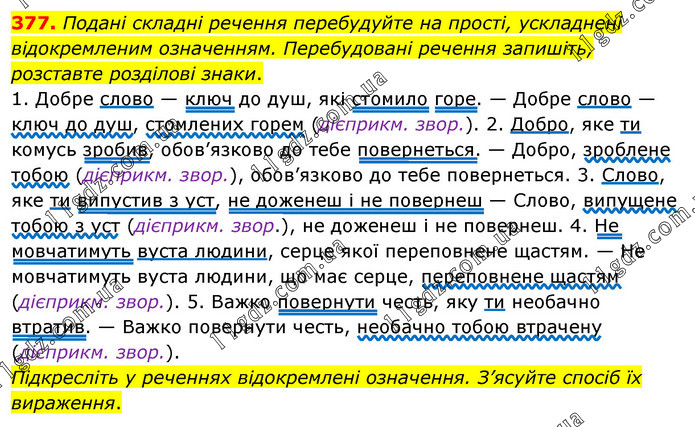 Подані складні речення перебудуйте на прості, ускладнені відокремленим означенням. Перебудовані речення запишіть, розставте розділові знаки. 1. Добре слово — ключ до душ, які стомило горе. — Добре слово — ключ до душ, стомлених горем (дієприкм. звор.). 2. Добро, яке ти комусь зробив, обов’язково до тебе повернеться. — Добро, зроблене тобою (дієприкм. звор.), обов’язково до тебе повернеться. 3. Слово, яке ти випустив з уст, не доженеш і не повернеш — Слово, випущене тобою з уст (дієприкм. звор.), не доженеш і не повернеш. 4. Не мовчатимуть вуста людини, серце якої переповнене щастям. — Не мовчатимуть вуста людини, що має серце, переповнене щастям (дієприкм. звор.). 5. Важко повернути честь, яку ти необачно втратив. — Важко повернути честь, необачно тобою втрачену (дієприкм. звор.). Підкресліть у реченнях відокремлені означення. З’ясуйте спосіб їх вираження.