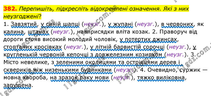 Перепишіть, підкресліть відокремлені означення. Які з них неузгоджені? 1. Завзятий, у синій шапці (неузг.), у жупані (неузг.), в червоних, як калина, штанах (неузг.), навприсядки вліта козак. 2. Праворуч від дороги стояв високий молодий чоловік, у потертих джинсах, стоптаних кросівках (неузг.), у літній барвистій сорочці (неузг.), у кругленькій червоній кепочці з довжелезним козирком (неузг.). 3. Місто невелике, з зеленими околицями та острівцями дерев і сквериків між низенькими будинками (неузг.). 4. Очевидно, суржик — мовна хвороба, на зразок раку мови (неузг.), тяжко виліковна, запущена.
