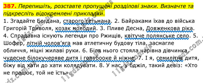 Перепишіть, розставте пропущені розділові знаки. Визначте та підкресліть відокремлені прикладки. 1. Згадайте Богдана, старого гетьмана. 2. Байраками їхав до війська Григорій Триволя, козак молодий. 3. Пливе Десна, Довженкова ріка. 4. Спрадавна існують легенди про Ржищів, квітуче полянське село. 5. Шофер, літній чолов’яга мав атлетичну будову тіла, засмагле обличчя, міцні жилаві руки. 6. Біля нього стояла чарівна дівчинка, чудесне білокучеряве дитя і голубооке й ніжне. 7. І я, семилітнє дитя, біжу від хати до хати колядувати. 8. У нас, у бджіл, такий девіз: «Хто не працює, той не їсть».