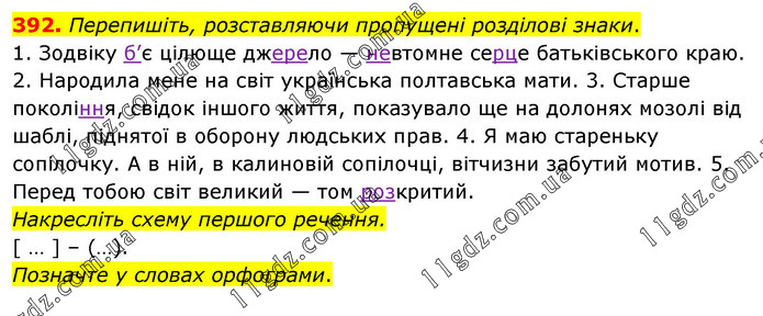 Перепишіть, розставляючи пропущені розділові знаки. 1. Зодвіку б’є цілюще джерело — невтомне серце батьківського краю. 2. Народила мене на світ українська полтавська мати. 3. Старше покоління, свідок іншого життя, показувало ще на долонях мозолі від шаблі, піднятої в оборону людських прав. 4. Я маю стареньку сопілочку. А в ній, в калиновій сопілочці, вітчизни забутий мотив. 5. Перед тобою світ великий — том розкритий. Накресліть схему першого речення. [ … ] – (…). Позначте у словах орфограми.