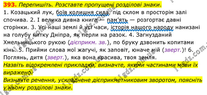 Перепишіть. Розставте пропущені розділові знаки. 1. Козацький лук, боїв колишня сила, під склом в просторім залі спочива. 2. І велика дивна книга — пам’ять — розгортає давні сторінки. 3. Усі наші землі й усі часи, історія нашого народу нанизані на голубу нитку Дніпра, як перли на разок. 4. Загнузданий Хмельницького рукою (дієприкм. зв.), по бруку дзвонить копитами кінь. 5. Прийми слова мої жагучі, як заповіт, юначе мій (зверт.)! 6. Поглянь, дитя (зверт.), яка вона красива, твоя земля. Назвіть відокремлені прикладки, визначте, якими частинами мови їх виражено. Визначте речення, ускладнене дієприкметниковим зворотом, поясніть у ньому розділові знаки.