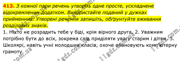 З кожної пари речень утворіть одне просте, ускладнене відокремленим додатком. Використайте поданий у дужках прийменник. Утворені речення запишіть, обґрунтуйте вживання розділових знаків. 1. Ніхто не розрадить тебе у біді, крім вірного друга. 2. Уважним потрібно бути до всіх, зокрема слід приділяти увагу старим і дітям. 3. Школярі, навіть учні молодших класів, охоче опановують комп’ютерну грамоту.