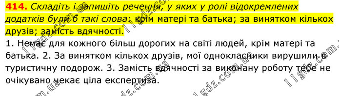 Складіть і запишіть речення, у яких у ролі відокремлених додатків були б такі слова: крім матері та батька; за винятком кількох друзів; замість вдячності. 1. Немає для кожного більш дорогих на світі людей, крім матері та батька. 2. За винятком кількох друзів, мої однокласники вирушили в туристичну подорож. 3. Замість вдячності за виконану роботу тебе не очікувано чекає ціла експертиза.