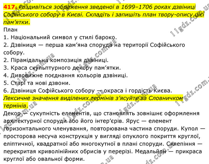 Роздивіться зображення зведеної в 1699–1706 роках дзвіниці Софійського собору в Києві. Складіть і запишіть план твору-опису цієї пам’ятки. План 1. Національний символ у стилі бароко. 2. Дзвіниця — перша кам’яна споруда на території Софійського собору. 2. Пірамідальна композиція дзвіниці. 3. Краса скульптурного декору пам’ятки. 4. Дивовижне поєднання кольорів дзвіниці. 5. Старі та нові дзвони. 6. Дзвіниця Софійського собору — окраса і гордість Києва. Лексичне значення виділених термінів з’ясуйте за Словничком термінів. Декор — сукупність елементів, що становлять зовнішнє оформлення архітектурної споруди або його інтер’єрів. Ярус — елемент горизонтального членування, повторювана частина споруди. Купол — просторова несуча конструкція у вигляді опуклого покриття круглої, еліптичної, квадратної або многокутної в плані споруди. Склепіння — перекритая криволінійних обрисів у перерізі. Медальйон — прикраса круглої або овальної форми.