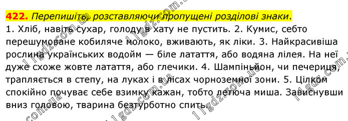 Перепишіть, розставляючи пропущені розділові знаки. 1. Хліб, навіть сухар, голоду в хату не пустить. 2. Кумис, себто перешумоване кобиляче молоко, вживають, як ліки. 3. Найкрасивіша рослина українських водойм — біле латаття, або водяна лілея. На неї дуже схоже жовте латаття, або глечики. 4. Шампіньйон, чи печериця, трапляється в степу, на луках і в лісах чорноземної зони. 5. Цілком спокійно почуває себе взимку кажан, тобто летюча миша. Зависнувши вниз головою, тварина безтурботно спить.