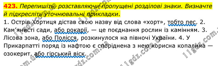 Перепишіть, розставляючи пропущені розділові знаки. Визначте й підкресліть уточнювальні прикладки. 1. Острів Хортиця дістав свою назву від слова «хорт», тобто пес. 2. Кам’янисті сади, або рокарії, — це поєднання рослин із камінням. 3. Лісова зона, або Полісся, розкинулося на півночі України. 4. У Прикарпатті поряд із нафтою є споріднена з нею корисна копалина — озокерит, або гірський віск.