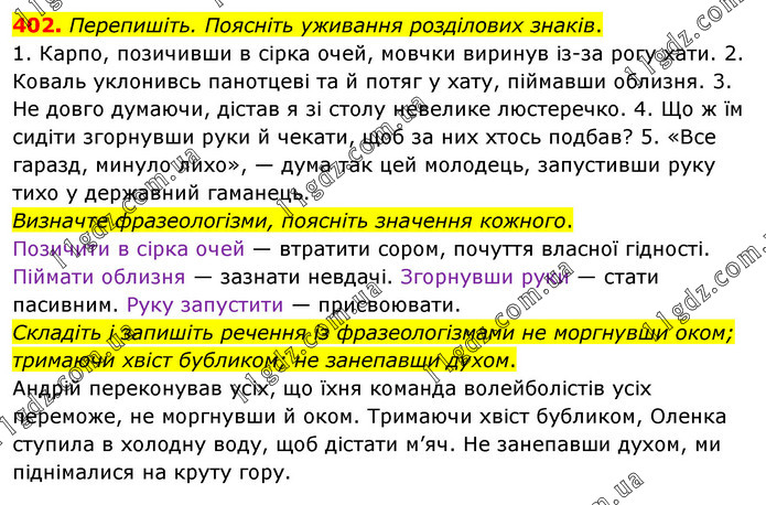 Перепишіть. Поясніть уживання розділових знаків. 1. Карпо, позичивши в сірка очей, мовчки виринув із-за рогу хати. 2. Коваль уклонивсь панотцеві та й потяг у хату, піймавши облизня. 3. Не довго думаючи, дістав я зі столу невелике люстеречко. 4. Що ж їм сидіти згорнувши руки й чекати, щоб за них хтось подбав? 5. «Все гаразд, минуло лихо», — дума так цей молодець, запустивши руку тихо у державний гаманець. Визначте фразеологізми, поясніть значення кожного. Позичити в сірка очей — втратити сором, почуття власної гідності. Піймати облизня — зазнати невдачі. Згорнувши руки — стати пасивним. Руку запустити — присвоювати. Складіть і запишіть речення із фразеологізмами не моргнувши оком; тримаючи хвіст бубликом; не занепавши духом. Андрій переконував усіх, що їхня команда волейболістів усіх переможе, не моргнувши й оком. Тримаючи хвіст бубликом, Оленка ступила в холодну воду, щоб дістати м’яч. Не занепавши духом, ми піднімалися на круту гору.
