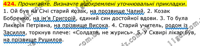 Прочитайте. Визначте відокремлені уточнювальні прикладки. 1. Ой був на Січі старий козак, на прозвище Чалий. 2. Козак Бобренко, на ім’я Григорій, єдиний син достойної вдови. 3. То була Ликерія Петрівна, на прізвище Висока. 4. Старий учитель, родом із Засилля, торкнув плече: «Солдате, не журись». 5. У Сквирі лікар був, на прізвище Рушилов.