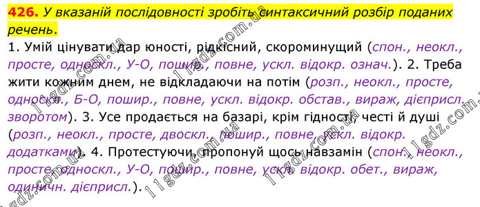 У вказаній послідовності зробіть синтаксичний розбір поданих речень. 1. Умій цінувати дар юності, рідкісний, скороминущий (спон., неокл., просте, односкл., У-О, пошир., повне, ускл. відокр. означ.). 2. Треба жити кожним днем, не відкладаючи на потім (розп., неокл., просте, односкл., Б-О, пошир., повне, ускл. відокр. обстав., вираж, дієприсл. зворотом). 3. Усе продається на базарі, крім гідності, честі й душі (розп., неокл., просте, двоскл., пошир., повне, ускл. відокр. додатками). 4. Протестуючи, пропонуй щось навзамін (спон., неокл., просте, односкл., У-О, пошир., повне, ускл. відокр. обет., вираж, одиничн. дієприсл.).