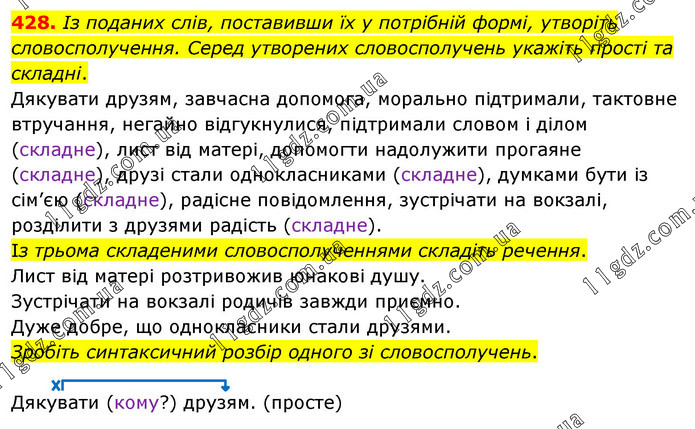 Із поданих слів, поставивши їх у потрібній формі, утворіть словосполучення. Серед утворених словосполучень укажіть прості та складні. Дякувати друзям, завчасна допомога, морально підтримали, тактовне втручання, негайно відгукнулися, підтримали словом і ділом (складне), лист від матері, допомогти надолужити прогаяне (складне), друзі стали однокласниками (складне), думками бути із сім’єю (складне), радісне повідомлення, зустрічати на вокзалі, розділити з друзями радість (складне). Із трьома складеними словосполученнями складіть речення. Лист від матері розтривожив юнакові душу. Зустрічати на вокзалі родичів завжди приємно. Дуже добре, що однокласники стали друзями. Зробіть синтаксичний розбір одного зі словосполучень. Дякувати (кому?) друзям. (просте)